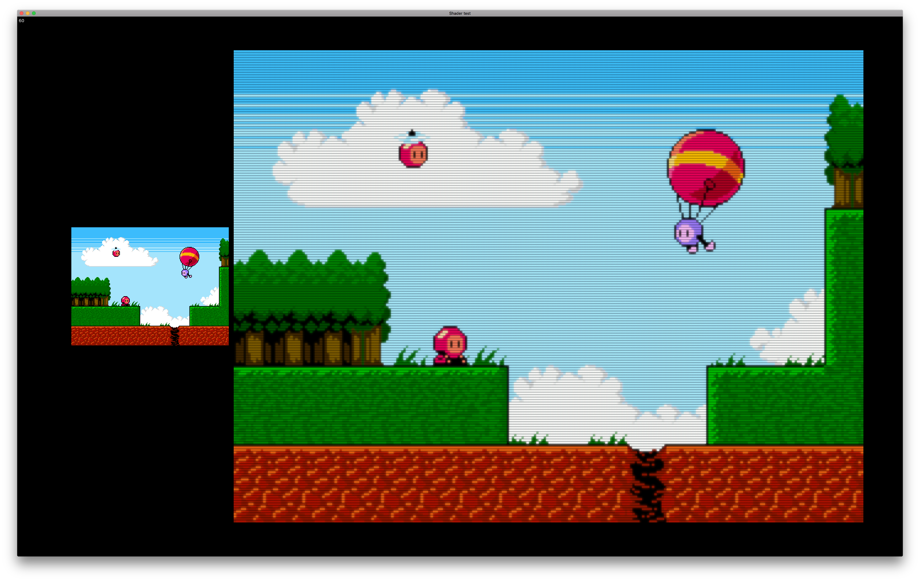 Monkey12345678910111213141516171819202122232425262728293031323334353637383940414243444546474849505152535455565758//@renderpasses 0,1,2varying vec2 v_TexCoord0;varying vec4 v_Color;//@vertexattribute vec4 a_Position;attribute vec2 a_TexCoord0;attribute vec4 a_Color;uniform mat4 r_ModelViewProjectionMatrix;uniform vec4 m_ImageColor;void main(){v_TexCoord0 = a_TexCoord0;v_Color = m_ImageColor * a_Color;gl_Position=r_ModelViewProjectionMatrix * a_Position;}//@fragmentuniform sampler2D m_ImageTexture0;uniform sampler2D m_Scanlines;uniform sampler2D m_Shadowmask;uniform vec2 m_Resolution;uniform float m_ColorBleed;uniform float m_GlowSize;uniform float m_GlowGain;uniform float m_ScanlineIntensity;uniform float m_ShadowMaskIntensity;void main(){//Scanline texture, mixed with white for fadingvec4 scanColor = mix( vec4(1.0, 1.0, 1.0, 1.0), texture2D( m_Scanlines, v_TexCoord0 * m_Resolution ), m_ScanlineIntensity );vec4 maskColor = mix( vec4(1.0, 1.0, 1.0, 1.0), texture2D( m_Shadowmask, v_TexCoord0 * m_Resolution ), m_ShadowMaskIntensity );//blur offset distancevec2 blurOffset = vec2( m_GlowSize / m_Resolution.x, m_GlowSize / m_Resolution.y );//blur in four directions based on offsetvec2 leftCoord = vec2( v_TexCoord0.x - blurOffset.x, v_TexCoord0.y );vec2 rightCoord = vec2( v_TexCoord0.x + blurOffset.x, v_TexCoord0.y );vec2 topCoord = vec2( v_TexCoord0.x, v_TexCoord0.y + blurOffset.y );vec2 bottomCoord = vec2( v_TexCoord0.x, v_TexCoord0.y - blurOffset.y );//blur colors are mixed for final glow color using BlurTexturevec4 glowX = mix( texture2D( m_ImageTexture0,rightCoord ), texture2D( m_ImageTexture0,leftCoord ), 0.5 );vec4 glowY = mix( texture2D( m_ImageTexture0,topCoord ), texture2D( m_ImageTexture0,bottomCoord ), 0.5 );vec4 glow = mix( glowX, glowY, 0.5 );//final color mixingvec4 color = texture2D( m_ImageTexture0,v_TexCoord0 );vec4 colorWithBleed = mix( max( color, glow ), color, 1.0 - m_ColorBleed );vec4 colorWithGlow = colorWithBleed + ( glow * m_GlowGain );gl_FragColor= ( colorWithGlow * v_Color ) * scanColor * maskColor;}And I massacred your M2 example as well heh:
