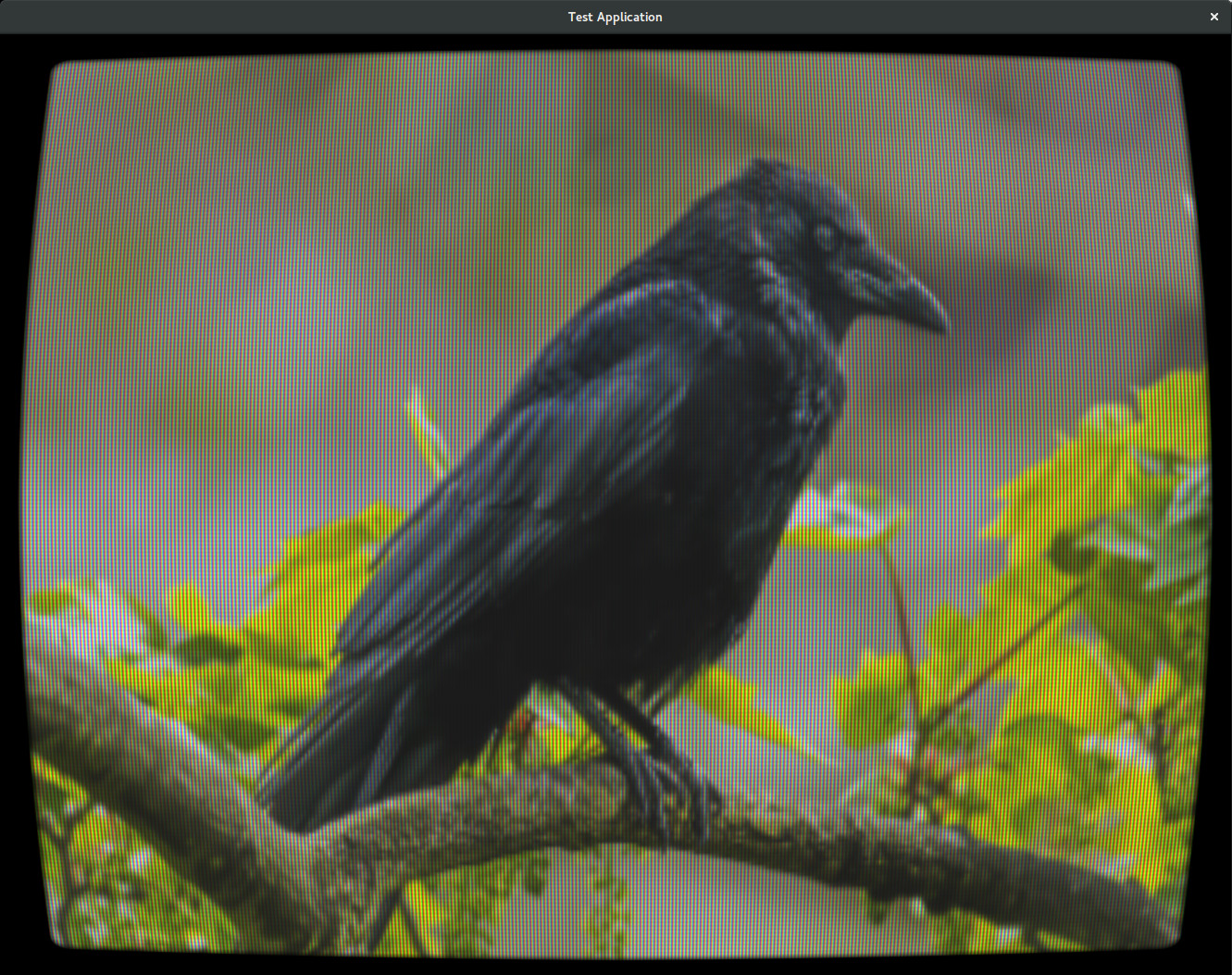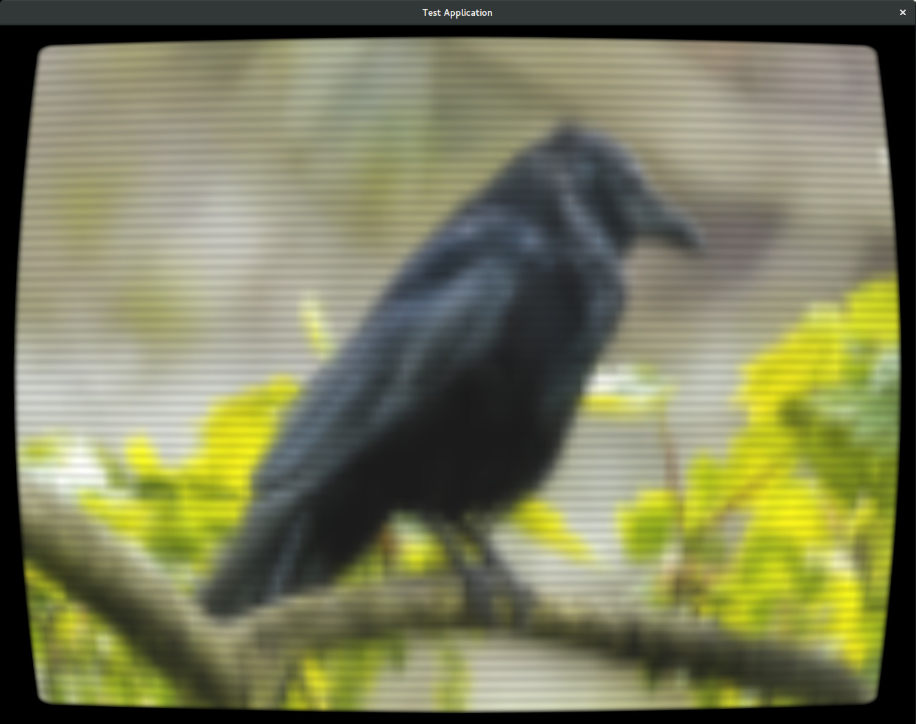 I changed some parameters. The image is now less distorted (but in the corners some pixels are not visible anymore). It is now also possible to set the intensity for rgb splitting (the vertical lines) as well as the intensity of the scan lines (the horizontal lines):