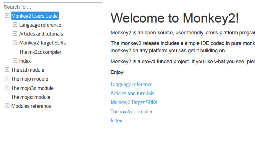- In the browseable docs (ie. those you view in a separate web browser), could the Index stuff be put at the top level for easier access to Keywords, etc? I think it’s one of the most useful parts of the documentation, gets you right to the details of how the language works, eg. to the Class documentation, which is otherwise quite hidden away. (I suppose this will be less of a problem once the IDE supports jumping to keyword docs, but still good to be browseable.)