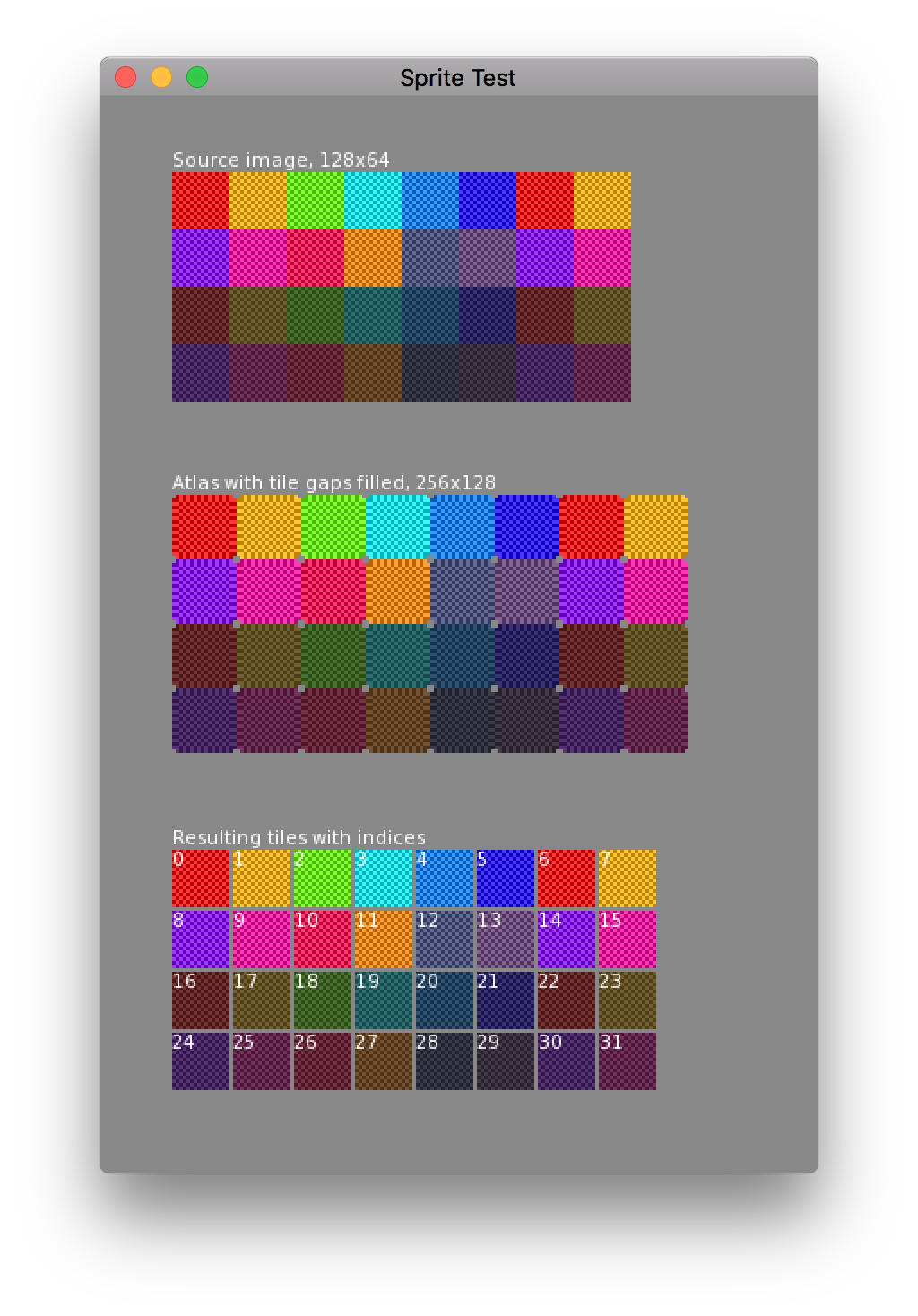 Once you load a PNG file, the Atlas class internally generates the gaps between tiles, even if they were created without gaps, and creates a texture atlas from that. You can then use Atlas.Cells[ index ] to access each individual image.And as a bonus, it converts any source image file into a “Power of Two” sized atlas, more guaranteed to work in all kinds of GPUs without artifacts like unwanted scaling.
