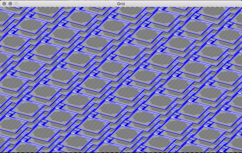 Monkey123456789101112131415161718192021222324252627282930313233343536373839404142434445464748495051525354555657585960616263646566676869707172737475767778798081828384858687888990919293949596979899100101102103104105106107108109110111112113114115116117118119120121122123124125126127128Namespace myapp#Import "<std>"#Import "<mojo>"Using std..Using mojo..Class PixelMap Extends PixmapMethod New(w:Int,h:Int)Super.New(w,h)endmethod Rect(rx:Int,ry:int,rw:int,rh:Int,c:Color)For Local y:=ry Until ry+rhFor Local x:=rx until rx+rwSetPixel(x,y,c)NextnextEndmethod Ball(rx:Int,ry:int,r:Int,c:Color)For Local y:=-r To rFor Local x:=-r To rLocal dd:=x*x+y*yIf dd<r*rSetPixel(rx+x,ry+y,c)endifNextnextEndEndClass TileField pixmap:=New PixelMap(32,32)Field image:ImageMethod New()pixmap.Clear(Color.None)pixmap.Rect(4,4,24,24,Color.Blue)pixmap.Rect(6,6,20,20,Color.DarkGrey)pixmap.Ball(16,16,10,Color.Black)For Local i:=5 to 27 Step 2pixmap.Rect(i,5,1,22,Color.White)nextimage=new Image(pixmap)endendClass GridWindow Extends WindowField framecount:IntField tile:TileMethod New()Super.New("Grid",800,480)ClearColor=Color.Blacktile=New Tile()EndMethod IsoView(c:Canvas, theta:Double, zoom:double)Local tx:=Cos(theta)*zoomLocal ty:=Sin(theta)*zoomzx=tyzy=txc.Matrix=new AffineMat3f(tx,ty*0.5,-ty,tx*0.5,400,240)EndField zx:DoubleField zy:DoubleGlobal Order4:=New Int[](1,0,0,1,0,1,-1,0,-1,0,0,-1,0,-1,1,0)Method OnRender( c:Canvas ) OverrideApp.RequestRender()Local zoom:=0.1*Mouse.Location.YLocal theta:=0.03*framecountIsoView(c,theta,zoom)' calulate draw order so we scan grid from far to nearLocal quadrant:Int=Int(2*theta/Pi)&3local ix:=Order4[quadrant*4+0]local jx:=Order4[quadrant*4+1]local iy:=Order4[quadrant*4+2]local jy:=Order4[quadrant*4+3]Local n:=20For Local i:=-n To nFor Local j:=-n To nLocal x:=i*ix+j*jxLocal y:=i*iy+j*jyFor Local z:=12 To 0 Step -3c.DrawImage(tile.image,x*34+z*zx,y*34+z*zy)' c.DrawImage(tile.image,x*24,y*24,theta)nextNextnextframecount+=1EndMethod OnKeyEvent( event:KeyEvent) OverrideIf event.Type=EventType.KeyDownIf event.Key=Key.EscapeApp.Terminate()Print "Escape"endifendifendEndFunction Main()New AppInstanceNew GridWindowApp.Run()EndAttachments: