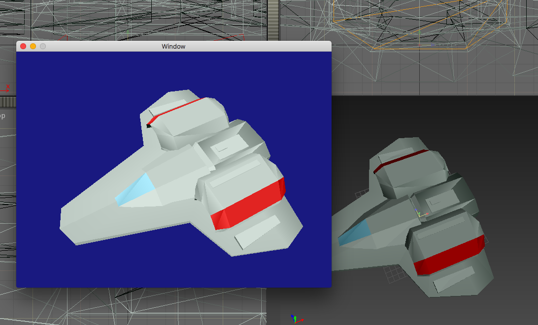 pic shows a monkey2 app with opengl window and model loaded and displayed correctly. in the background you can also see the same model as it looks in the modeller with all the vertex colors being correct…