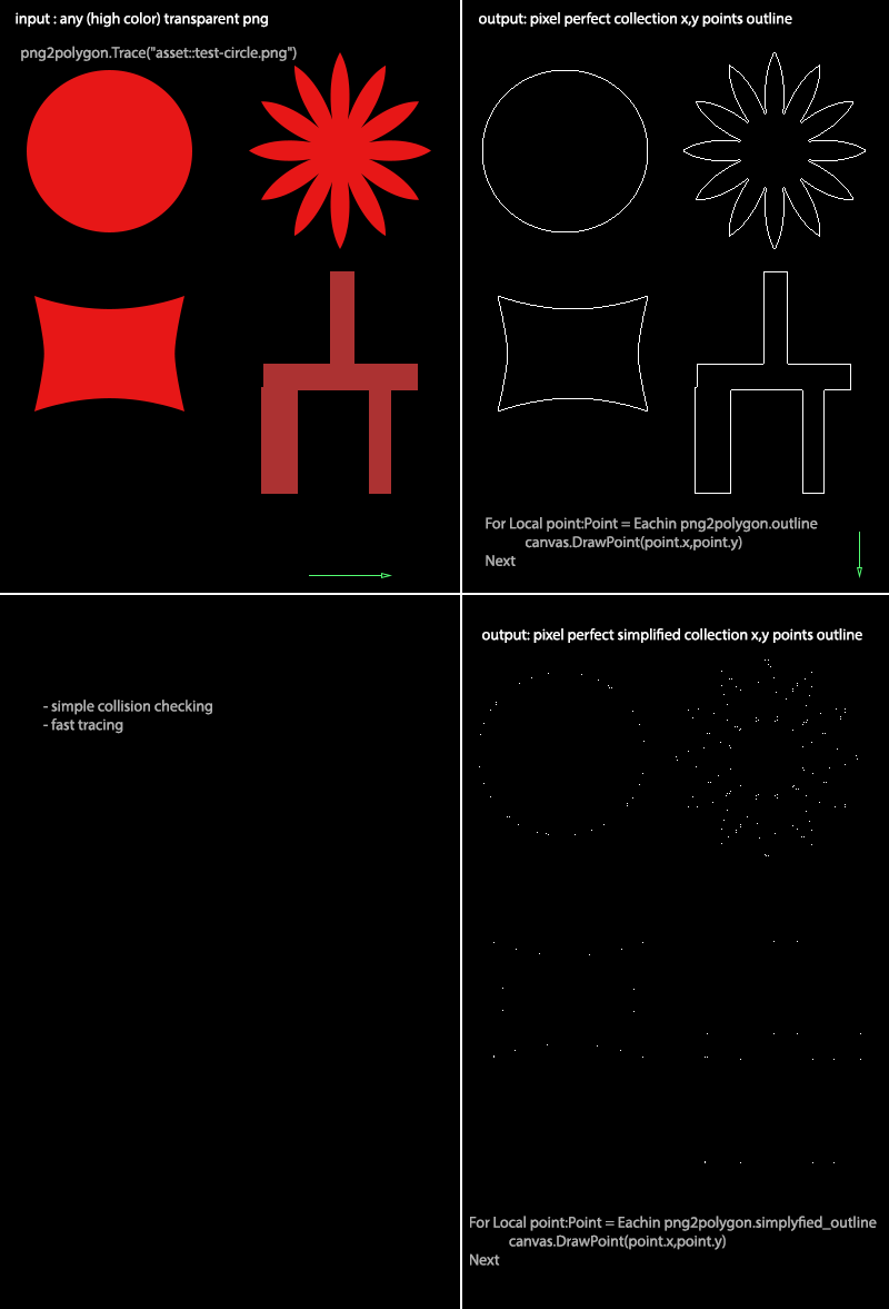 And use it something like this:Monkey12345678Local CollisionType:Int = PolyCollision(verts,Mouse.X,Mouse.Y)If CollisionType=0 Then' no collisionElseif CollisionType=1 Then' line collisionElseif CollisionType=2 Then' point insideEndAs you can see, the simplified coordinates are way less x,y points then the total png2polygon.outline points.