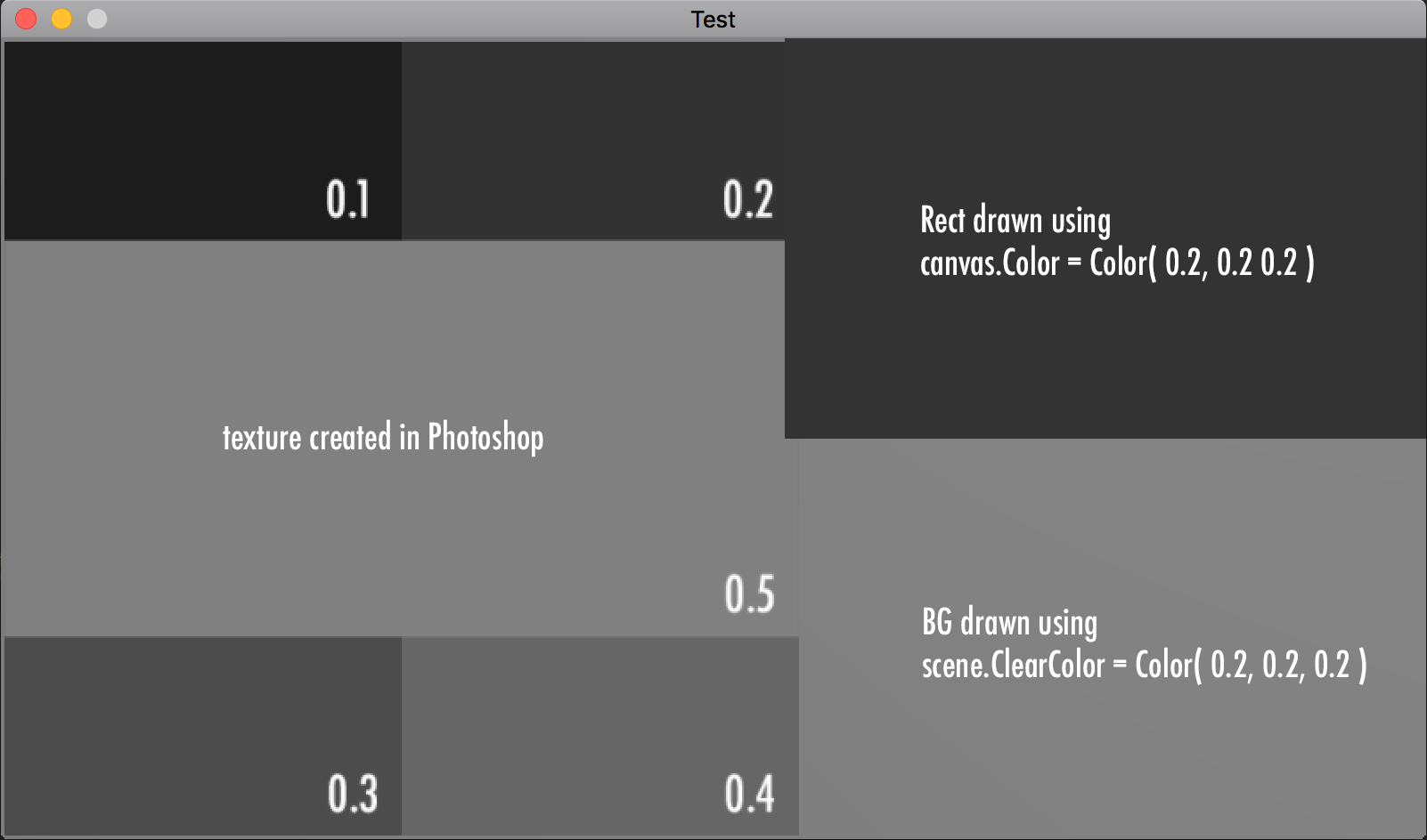 I made a texture in Photoshop with values from 0.1 to 0.5, brought it in as a sprite, and it looks in Mojo3d exactly like what it should! But drawing a rect in Mojo with Color(0.2, 0.2, 0.2) and using the same color as the scene.ClearColor gives me different results, which feels unintuitive. Here’s a screenshot: