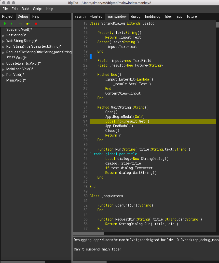 Monkey1234567891011Method RequestFile:String( title:String,filters:String,save:Bool,path:String="" )Local future:=New Future<String>App.Idle+=Lambda()future.Set( mojo.requesters.RequestFile( title,filters,save,path ) )EndReturn future.Get()EndWhat this does is ‘switch back’ to main thread (App.Idle callbacks always run on the main thread) to run the native requester, and then switch back to the original fiber after the requester completes. Note that this was a special case fix that was only necessary due to limitations of system requesters (and the old fiber system). With the new fiber system, this wrapper should no longer be necessary as fibers are no longer threads (so you can now safely render on fibers too!).