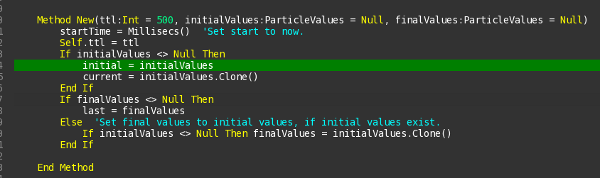 Monkey12345Method New(factory:ParticleFactory, interval:Int, ttl:Int = 500, LockParticlesToEmitter:Bool = False)Super.New(ttl, Self.initial, Self.last)...End MethodThis is invoking Super.New using ‘unconstructed’ fields of the super class as parameters, ie: Self.initial and Self.last (which are really members of BaseParticle). This is IMO kind of nonsense code, like Local k:=k or something.