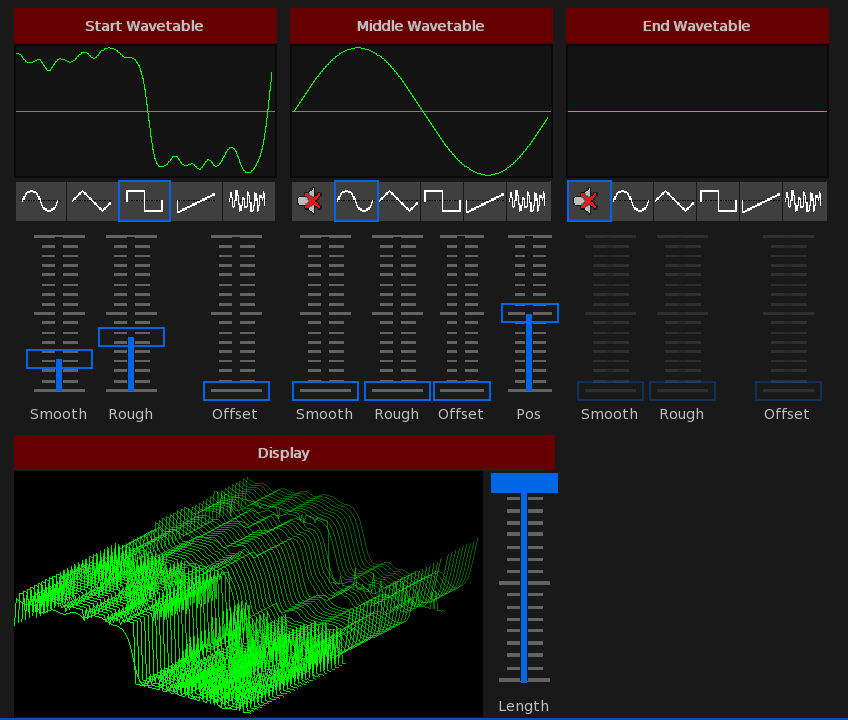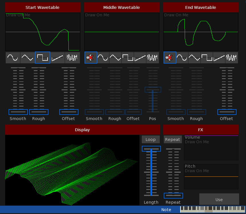 In essence a ‘new’ sound can be constructed from up to 3 user waveforms (start, end and middle, with the middle being movable)