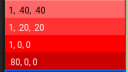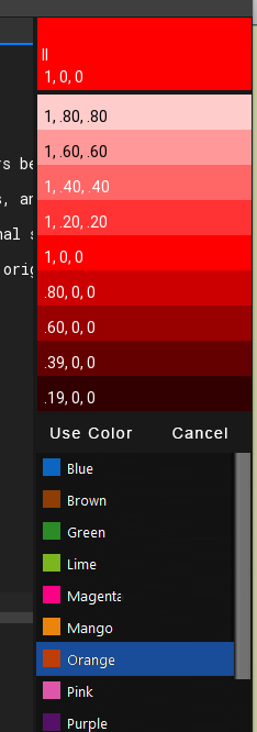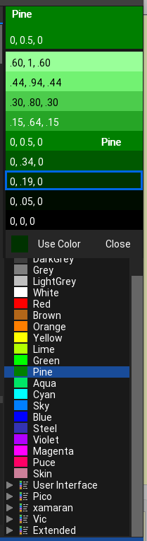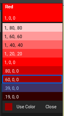 Each color is named and has a float value. at the top is the selected color, and below is a ramped version of the color showing 8 variations (plus the original in the centre)
