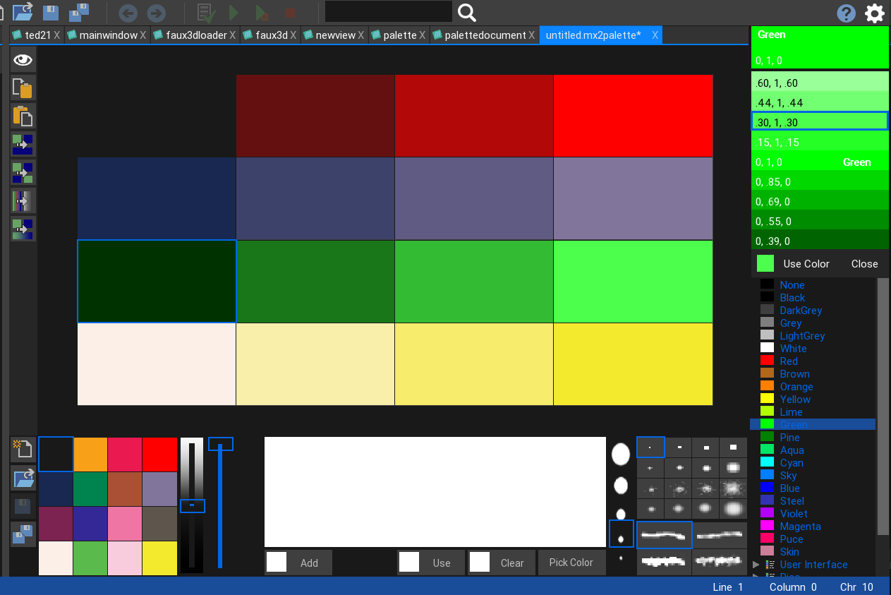 Lastly on the bottom is the pain palette. here you can make new palettes, load saved palettes (the same as the main window) and use paint controls to mix colors to your hearts content. You can also use ‘pick’ to select colors from the paint area or even from images that you are viewing. Pressing use has the same effect as the color palette. it will add the current color to the palette or add the correct text if you are in a monkey document