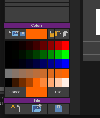 color 0 is blank/transparent. when the actual color is clicked then you get a quick color editor (as shown in the third pic). its a basic rgb with saturation and light and allows for quick editing. There is the ability to load and save different palettes. Once merged into ted21 you will also have the 2 color palettes to pick colors from.