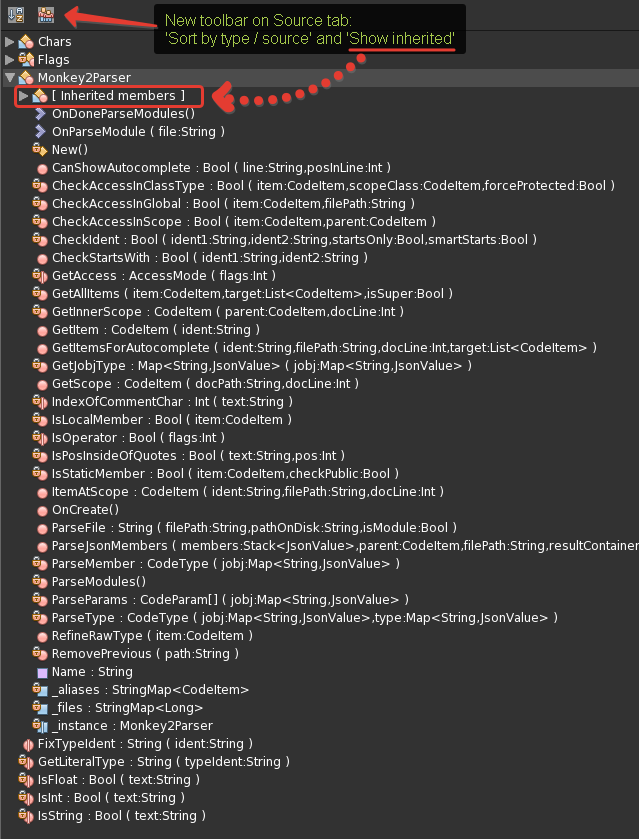 - Sort by type – sort by type and name if toggled, sort by position in source if untoggled