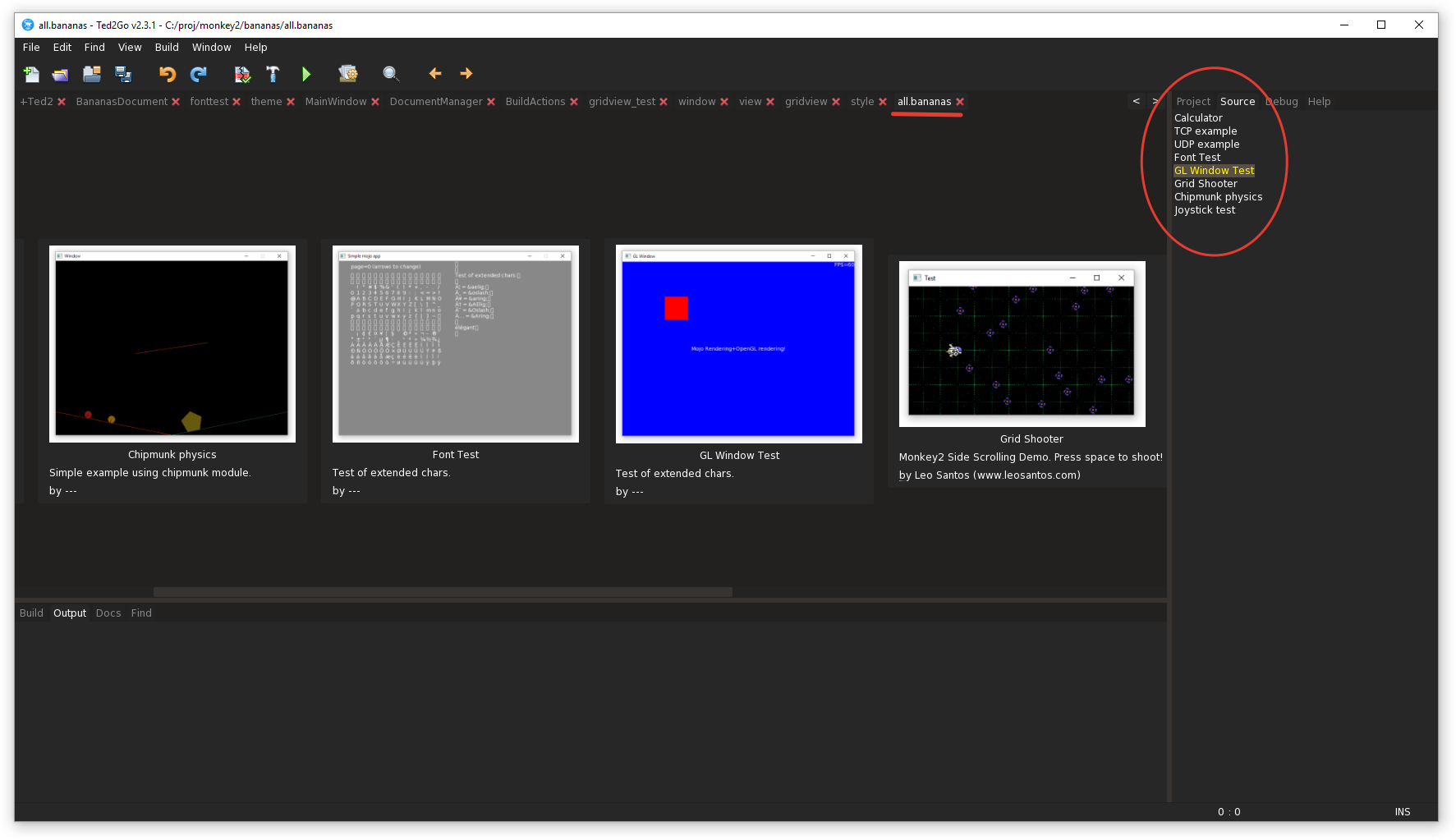 Monkey1234567{"title":"Grid Shooter","author":"Leo Santos (www.leosantos.com)","description":"Monkey2 Side Scrolling Demo. Press space to shoot!","picture":"picture.png","file":"gridshooter.monkey2"}When user click on title – source file will be opened and set as lock file, and all we need is press “Build & Run”.