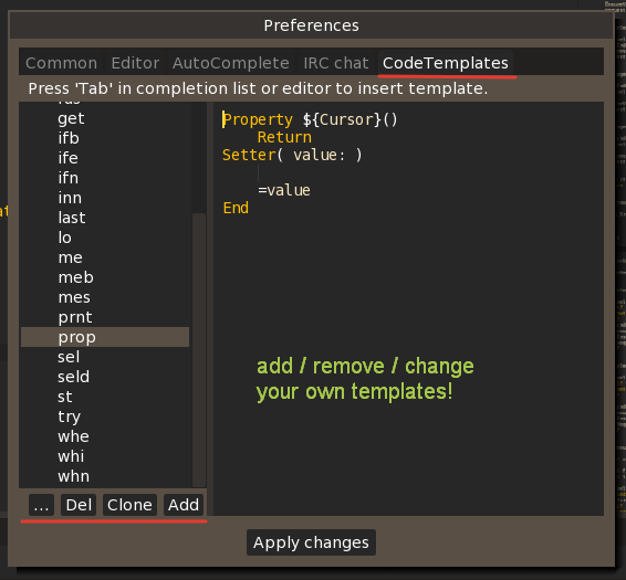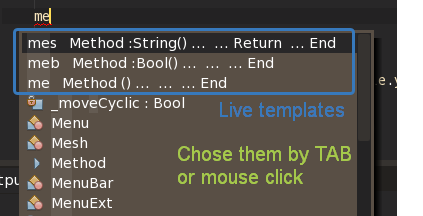 - ! Live templates feature – you just type short combination (like ‘prop’), press TAB and get whole code constuction (for ex. property with setter and getter).