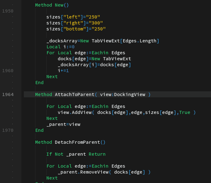 Monkey123456789101112131415161718192021222324252627282930313233343536373839404142434445464748495051525354555657585960616263646566676869707172737475767778798081828384858687888990919293949596979899100101102103104105106107108109110111112113114115116117118119120121122123124125126127128129130Class PluginTextView_MoveLine Extends PluginTextViewPublicProperty Name:String() OverrideReturn "Move a line or a selection of lines."EndProperty Shortcut:String() OverrideReturn "Alt + Up/Down Arrow"EndProtectedMethod New()AddPlugin(Self)EndMethod OnFilterKeyEvent(event:KeyEvent, textView:TextView) OverrideIf IsModifierPressed(event.Modifiers, Modifier.Alt)If event.Type = EventType.KeyDownIf event.Key = Key.UpMoveLineVertical(textView, -1)event.Eat()ReturnEndIf event.Key = Key.DownMoveLineVertical(textView, 1)event.Eat()ReturnEndIf event.Key = Key.EnterPrint("Cursor: " + textView.Cursor)event.Eat()ReturnEndEndEndEndPrivateMethod Column:Int(index:Int)Return index - TextViewFeat.TextViewInstance.Document.StartOfLine(TextViewFeat.TextViewInstance.Document.FindLine(index))EndMethod MoveLineVertical(textView:TextView, delta:Int)Local textViewAnchor := Min(textView.Anchor, textView.Cursor)Local textViewCursor := Max(textView.Anchor, textView.Cursor)' get linesLocal blockLineStart := textView.Document.FindLine(textViewAnchor)Local blockLineEnd := textView.Document.FindLine(textViewCursor)' store cursor and anchor column indexLocal storeAnchorColumn := Self.Column(textViewAnchor)Local storeCursorColumn := Self.Column(textViewCursor)' recalculate line rangeIf delta = 0 Then ReturnIf delta < 0 Then blockLineStart -= 1If delta > 0 Then blockLineEnd += 1' validate line rangeIf blockLineStart < 0 Then ReturnIf blockLineStart >= textView.Document.NumLines Then Return' get the text rangeLocal blockLines := New StringListFor Local line := blockLineStart To blockLineEndblockLines.Add(textView.Document.GetLine(line))Next' perform the line swappingIf delta < 0 ' when moving up first cell becomes the lastLocal a := blockLines.RemoveFirst()blockLines.AddLast(a)Else ' when moving down last cell becomes the firstLocal z := blockLines.RemoveLast()blockLines.AddFirst(z)End' replace the textLocal blockText := blockLines.Join("~n")textView.SelectText(TextViewFeat.LineStartIndex(blockLineStart), TextViewFeat.LineEndIndex(blockLineEnd))textView.ReplaceText(blockText)' restore cursor positionLocal getPosition := Lambda:Int(textView:TextView, line:Int, column:Int)Return textView.Document.StartOfLine(line) + columnEndIf textViewAnchor = textViewCursor' no text is selectedLocal newCursor := 0If delta < 0newCursor = getPosition(textView, blockLineStart, storeCursorColumn)ElsenewCursor = getPosition(textView, blockLineStart + 1, storeCursorColumn)EndtextView.SelectText(newCursor, newCursor)Else' text is selectedLocal newAnchor := 0Local newCursor := 0If delta < 0newAnchor = getPosition(textView, blockLineStart, storeAnchorColumn)newCursor = getPosition(textView, blockLineEnd - 1, storeCursorColumn)ElsenewAnchor = getPosition(textView, blockLineStart + 1, storeAnchorColumn)newCursor = getPosition(textView, blockLineEnd, storeCursorColumn)EndtextView.SelectText(newAnchor, newCursor)EndEndMethod MoveLineHorizontal(textView:TextView, direction:Int)EndGlobal _instance := New PluginTextView_MoveLineEndMarch 11, 2018 at 3:45 pm #13963@cocon thanks! maybe I’ll get something of your code.