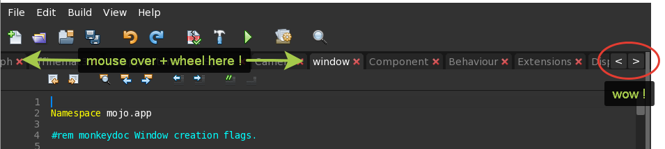Scrolling of code tabs by mouse wheel or by buttons Prev / Next in the right top corner. Buttons just scroll area by 200px.
