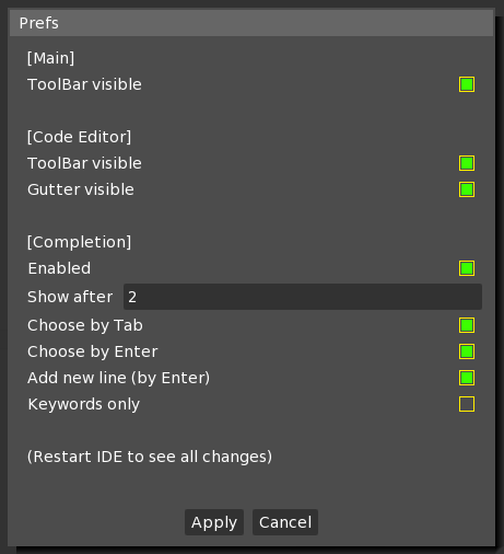 - New – added Preferences dialog to manage autocomplete state, show/hide toolbars and gutter. Stored in ted2.state.json. (see screenshot) [**]