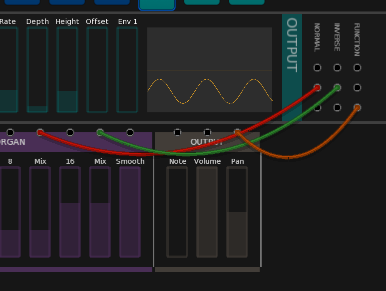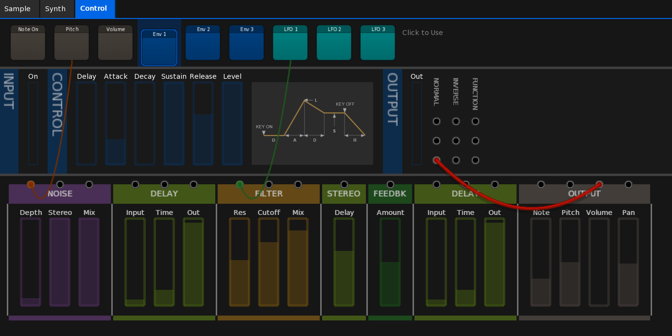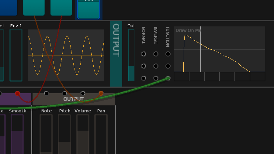 This shows the extended output section plus fully operational Envelope1 section. Notice that wires connecting hidden controls are also now shown (thinner) so you know what is going on. The only thing missing is the function part…