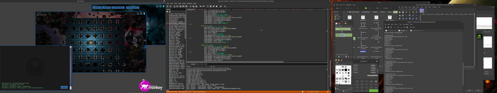 I’ve posted a ‘wide’ screen shot of my desktop showing some of the error reporting work I have been doing with Alien Phoenix. You can just make out an error being reported in a console in an app (left side of screen) using Alien Phoenix and in the TED2GO IDE (center). Even though an error message indicates an image is missing the framework will in many cases report the error and continue to run. This aspect should be useful in game development both in error reporting and robust continued app operation despite common errors like a missing image.