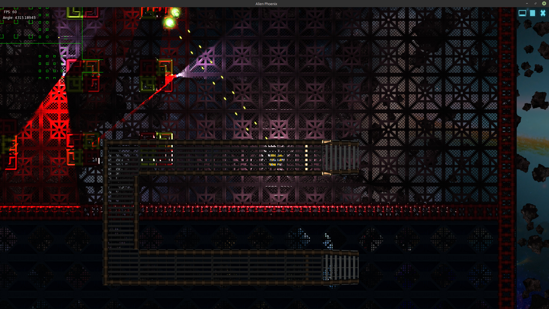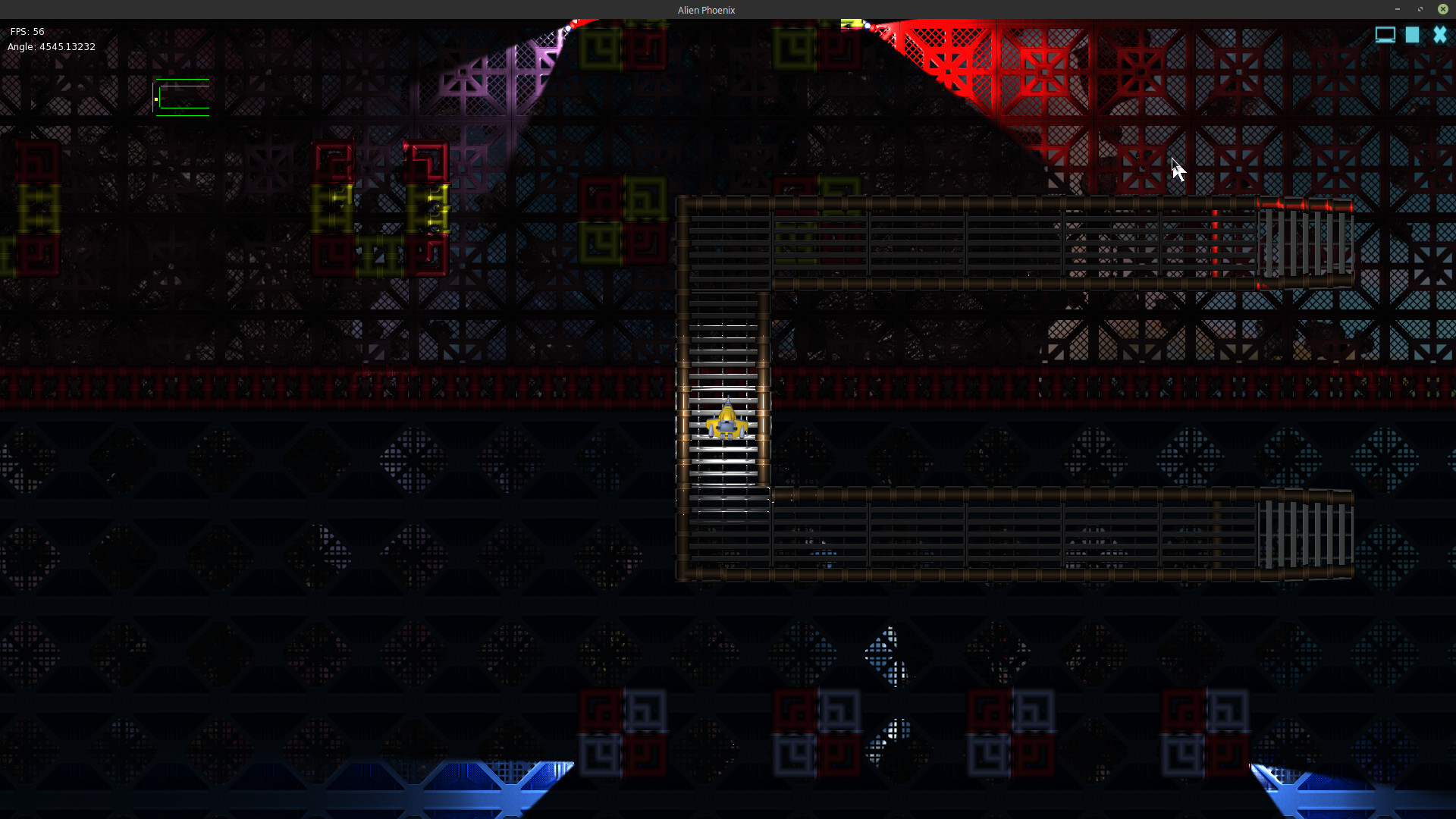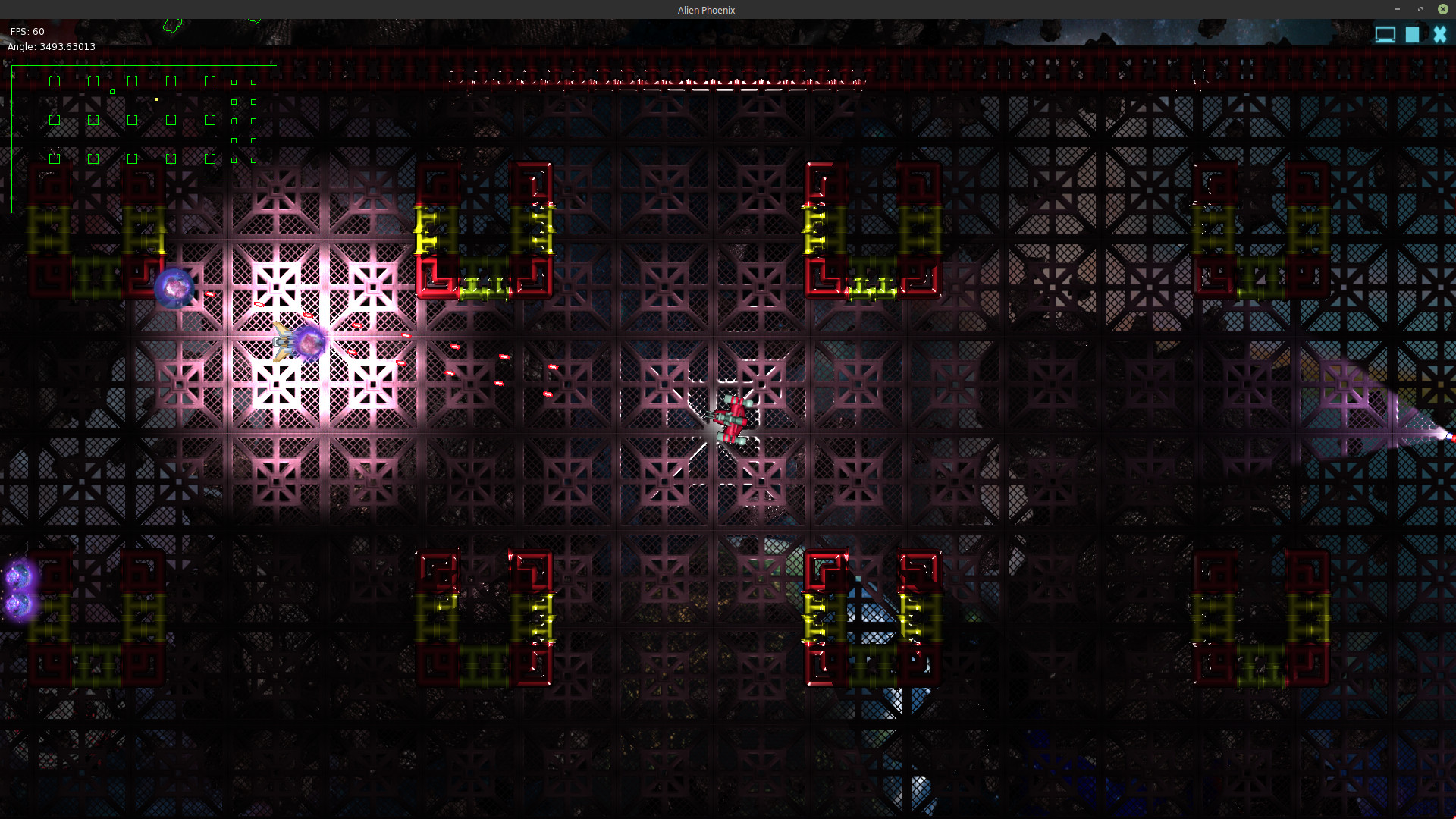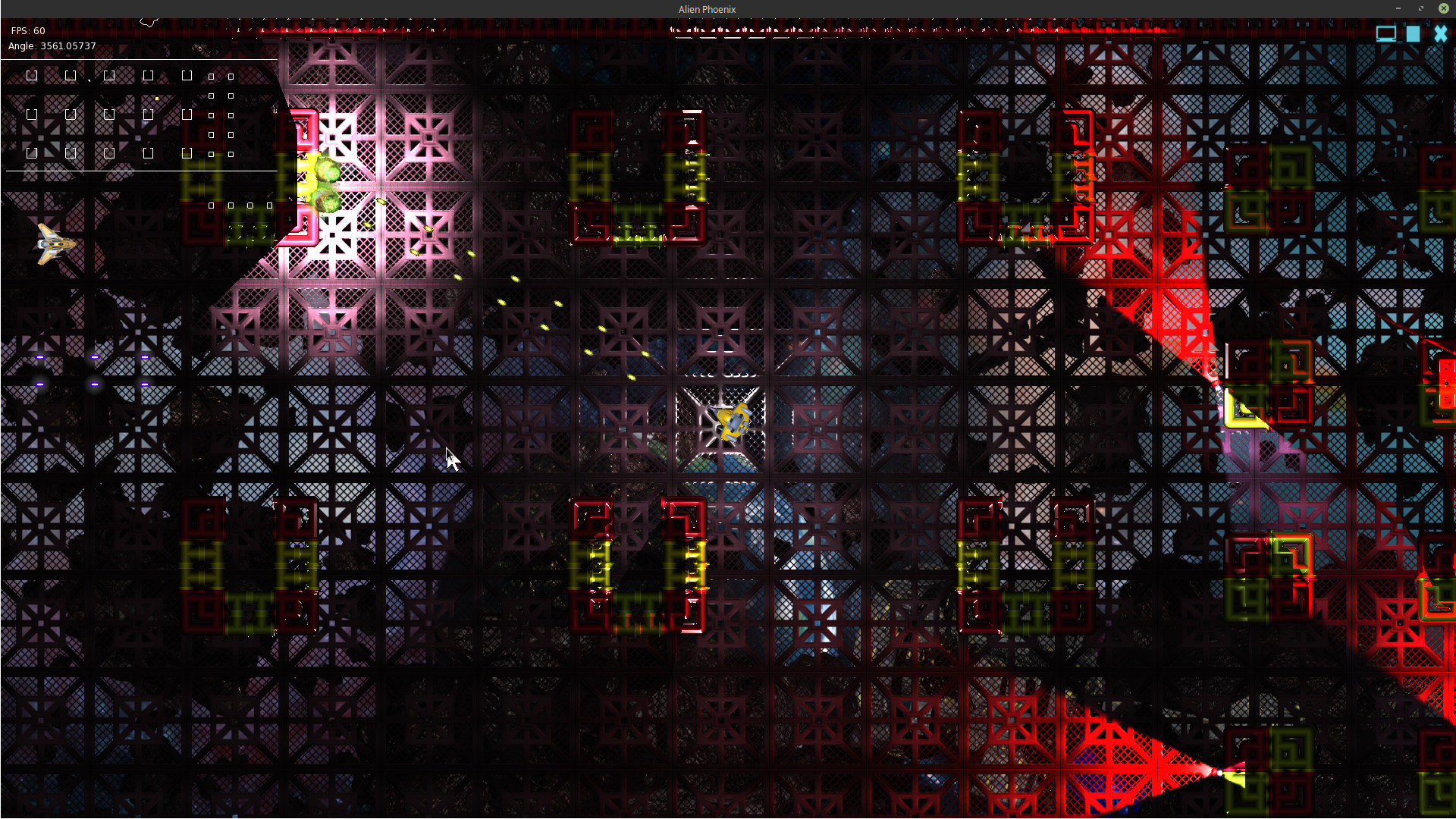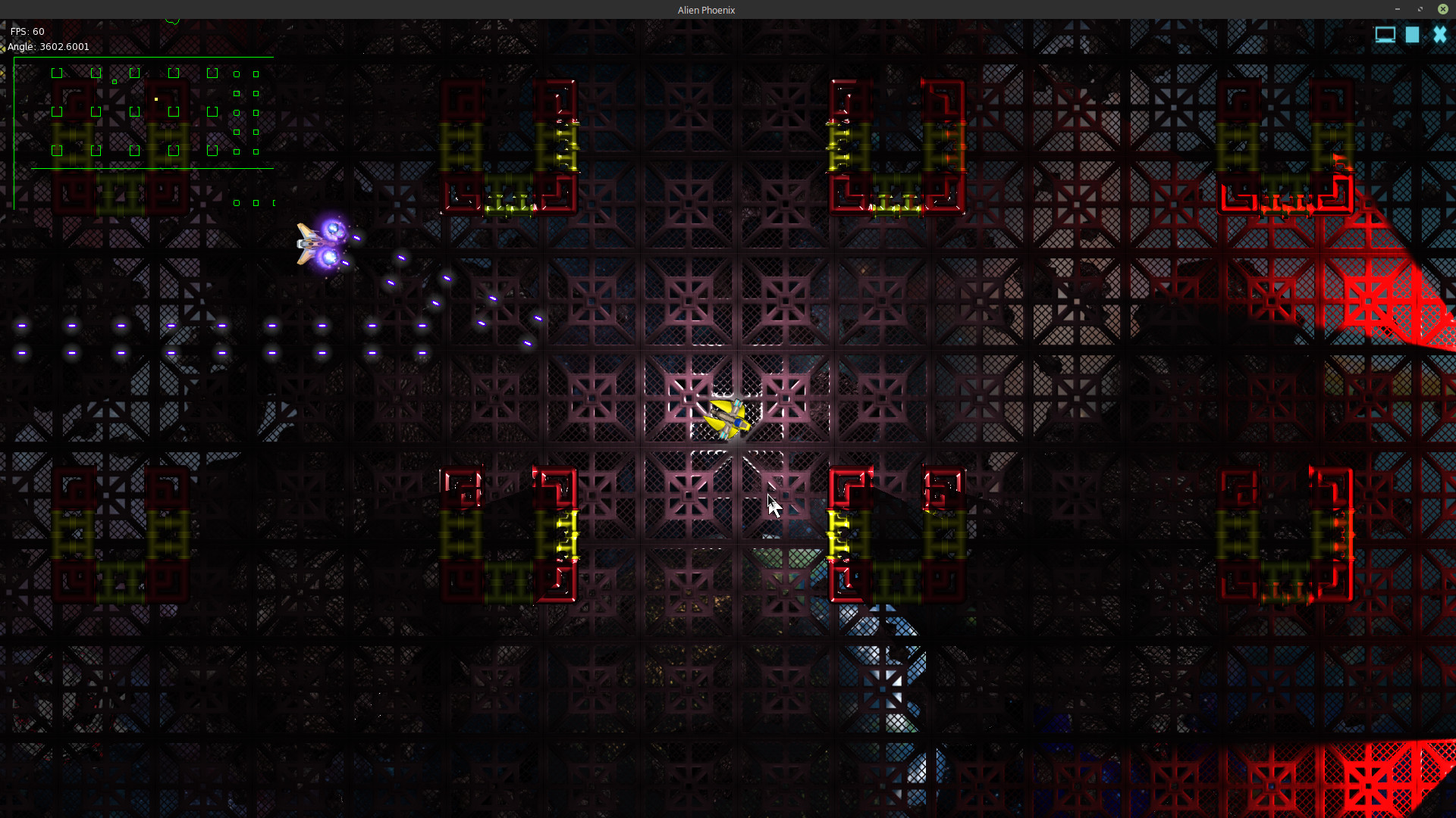 A couple of images showing weapon to ship collision. This is a tough thing to implement as every bullet and every ship has to be polled for collision normally. Alien Phoenix’s map system uses a sort of tree-map which allows a much more efficient collision monitoring process. Still, aiming for 100 ships (players) and possibly a 1000 weapon entities (at once) is a tall order on a single CPU core. I think I can pull it off.
